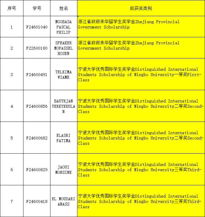 自费国际学生奖学金评定与管理办法》等文件精神,经学生本人申请,学院留学生奖学金评审小组评审,学院学生工作领导小组审核,现将2025年宁波大学自费国际学生老生奖学金评定拟获奖名单公示如下: